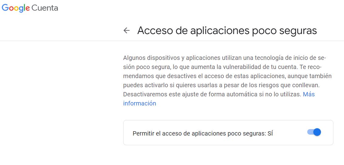 Activa la opción "Permitir el acceso de aplicaciones poco seguras: " como SI.